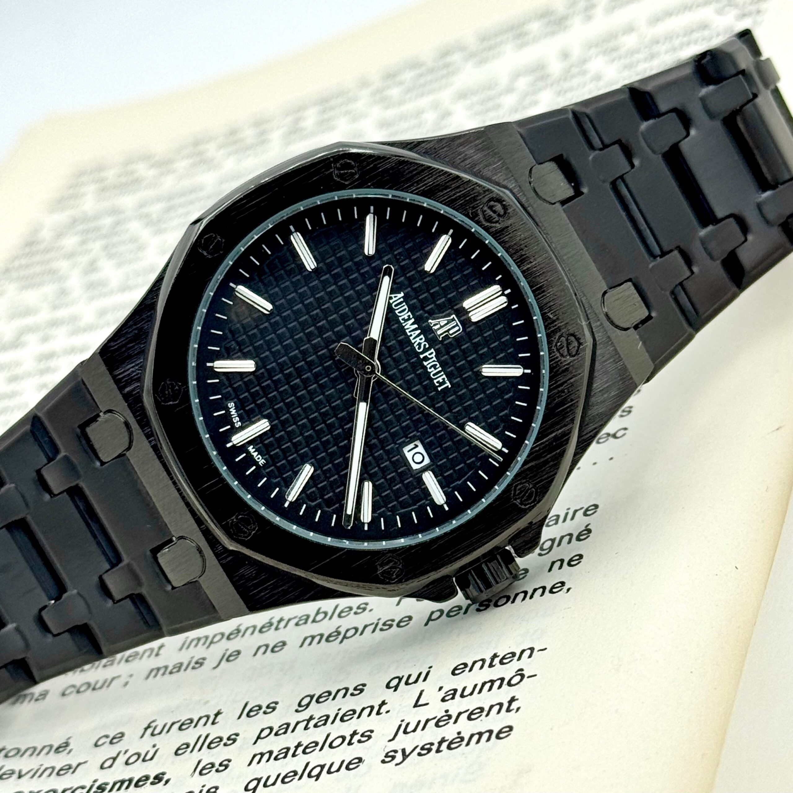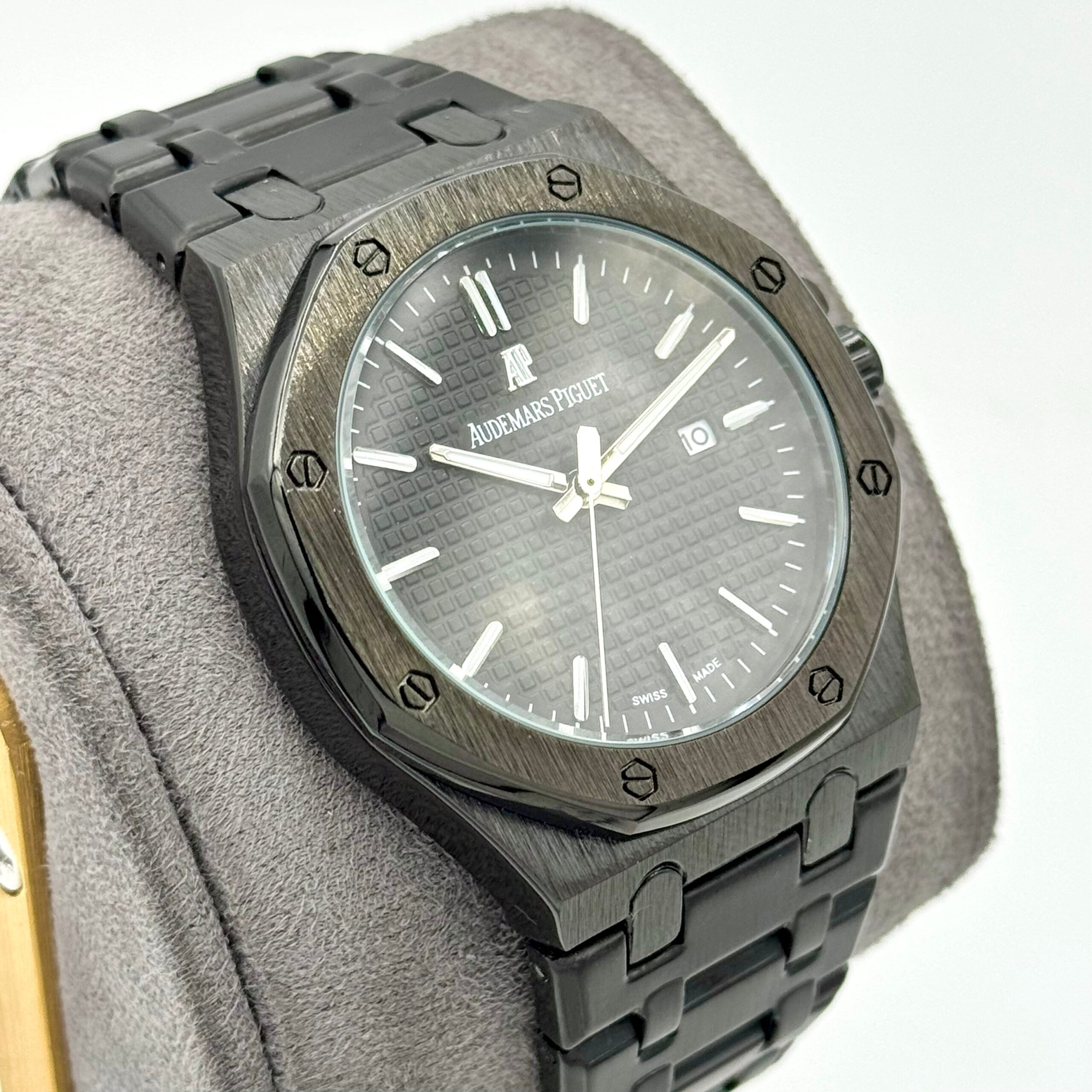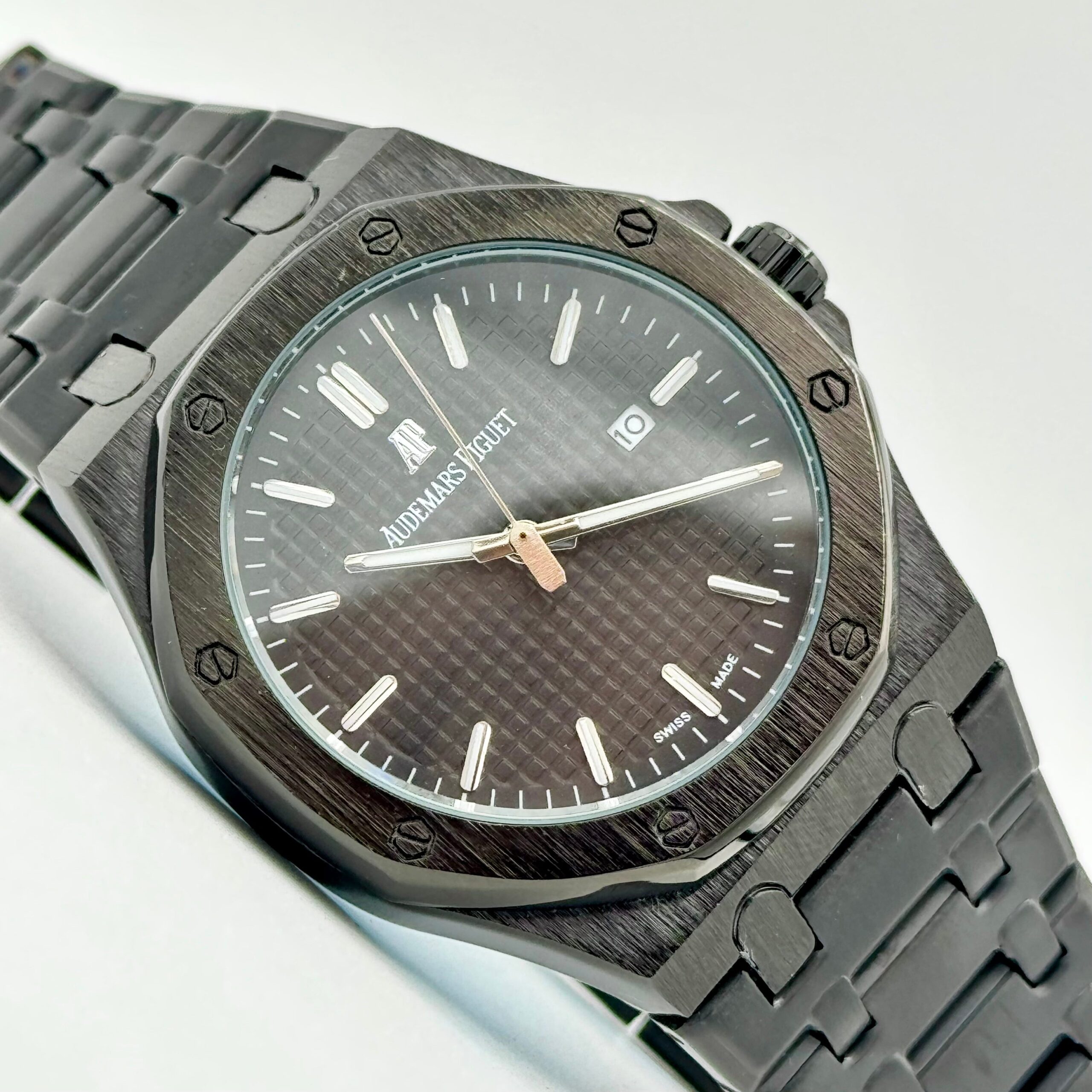 A true icon of modern horology, the Audemars Piguet Royal Oak with a full black dial is the epitome of bold sophistication and mechanical excellence. Housed in the signature octagonal bezel with exposed screws, the stainless steel case showcases a harmonious blend of brushed and polished finishes. The black “Grande Tapisserie” dial, with its textured pattern and luminous white gold hour markers, delivers a refined yet sporty aesthetic.