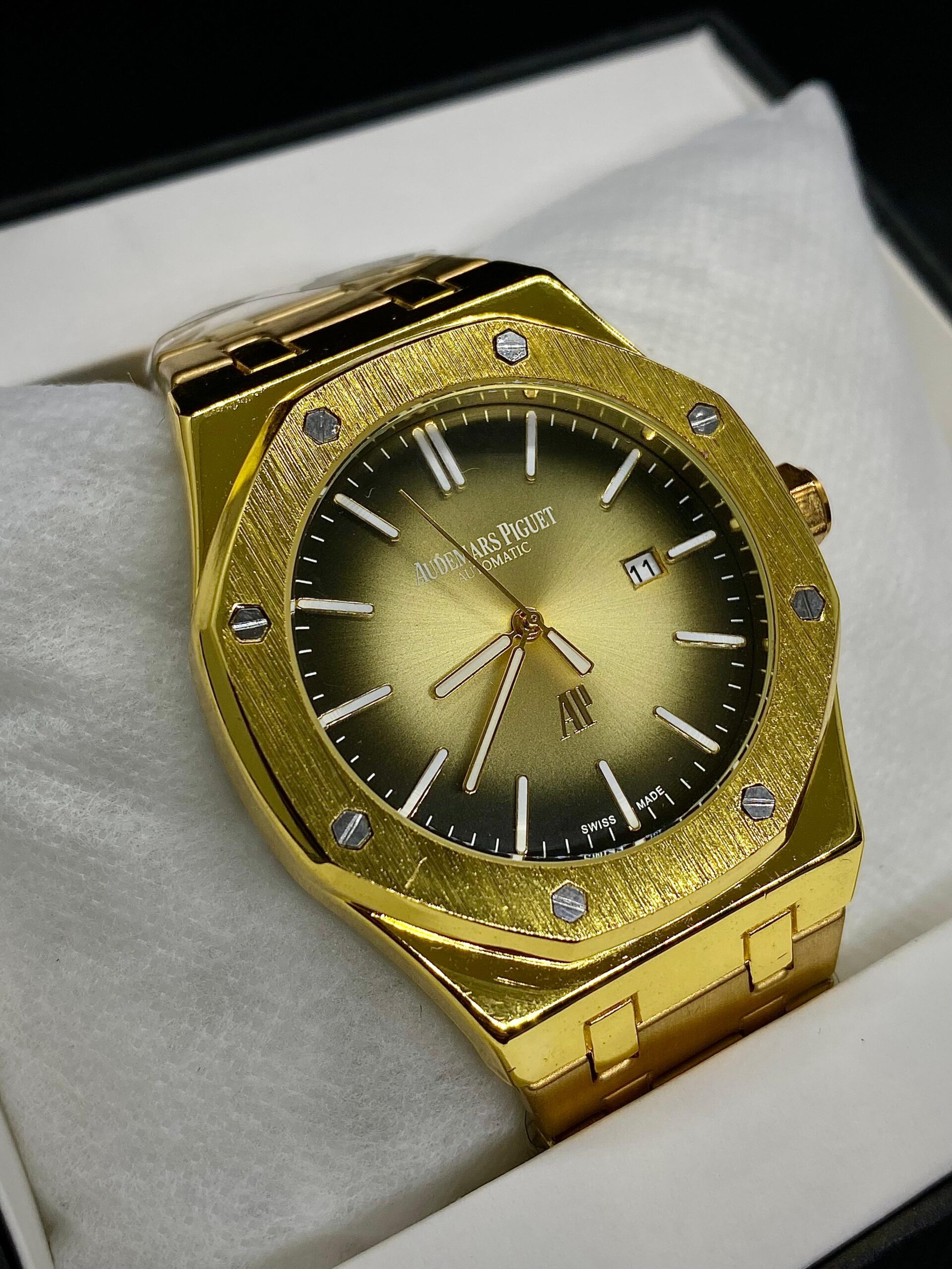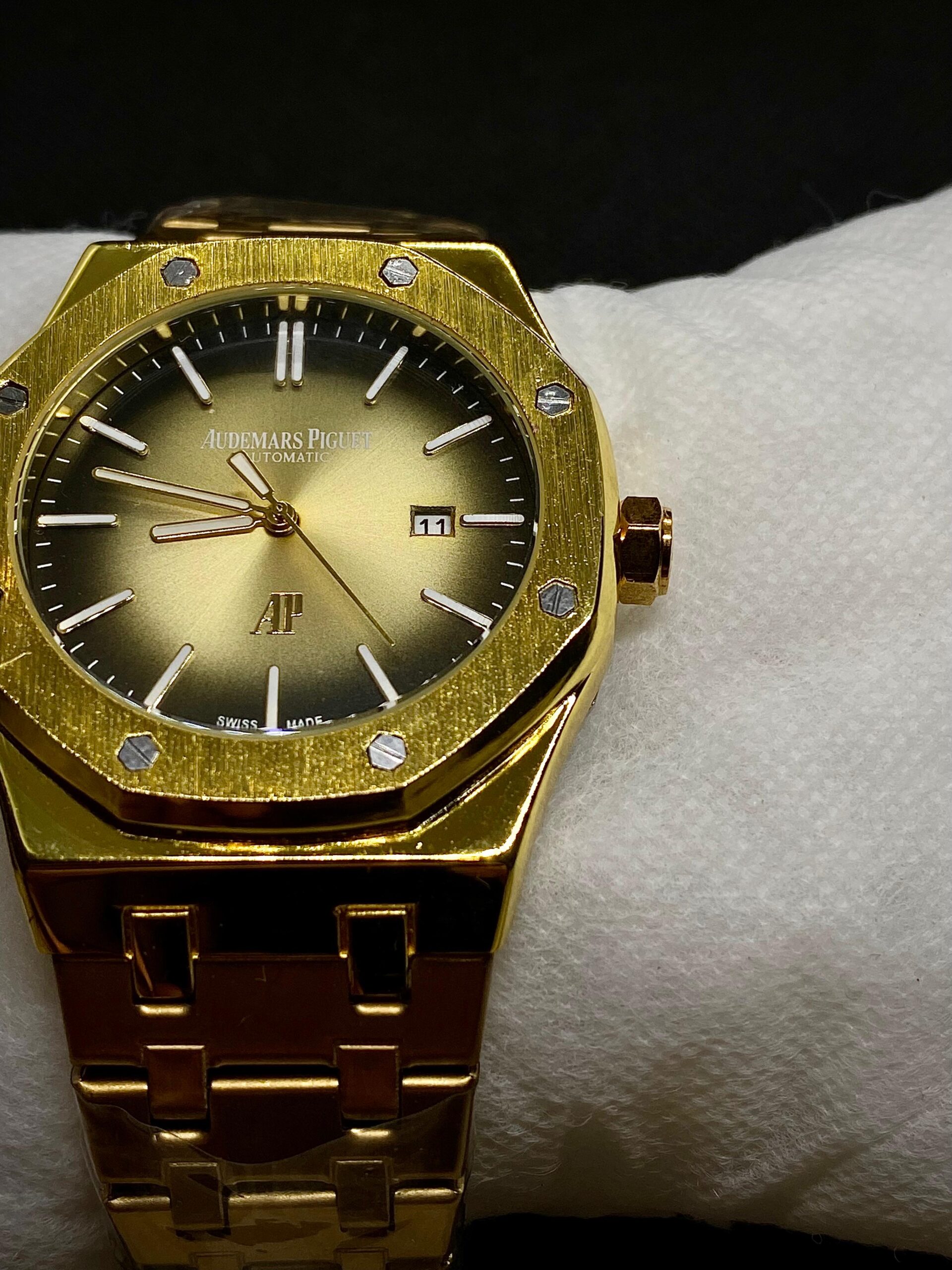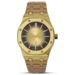 Clean, refined, and unmistakably iconic, the Audemars Piguet Royal Oak with a Golden Yellow Smoked dial is a celebration of pure design and horological mastery. The signature octagonal bezel with exposed hexagonal screws sits atop a meticulously brushed stainless steel case, embodying strength and elegance. The crisp white “Grande Tapisserie” dial adds a touch of understated luxury, beautifully contrasted by luminous gold hour markers and hands for clear readability.