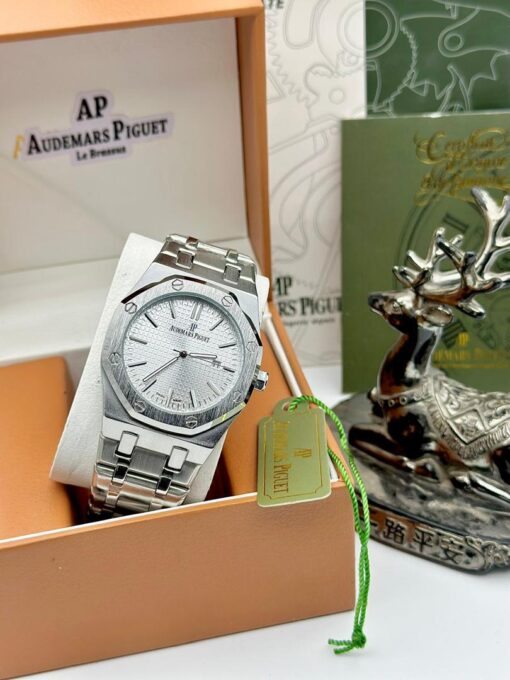 Clean, refined, and unmistakably iconic, the Audemars Piguet Royal Oak with a white dial is a celebration of pure design and horological mastery. The signature octagonal bezel with exposed hexagonal screws sits atop a meticulously brushed stainless steel case, embodying strength and elegance. The crisp white “Grande Tapisserie” dial adds a touch of understated luxury, beautifully contrasted by luminous white gold hour markers and hands for clear readability.