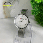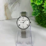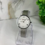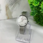 Curren 9020 women’s watch with a stainless steel mesh band and a white dial. The watch face features Roman numeral hour markers at the 12, 3, 6, and 9 o’clock positions, and the brand name “CURREN BLANCHE” is printed below the 12 o’clock marker