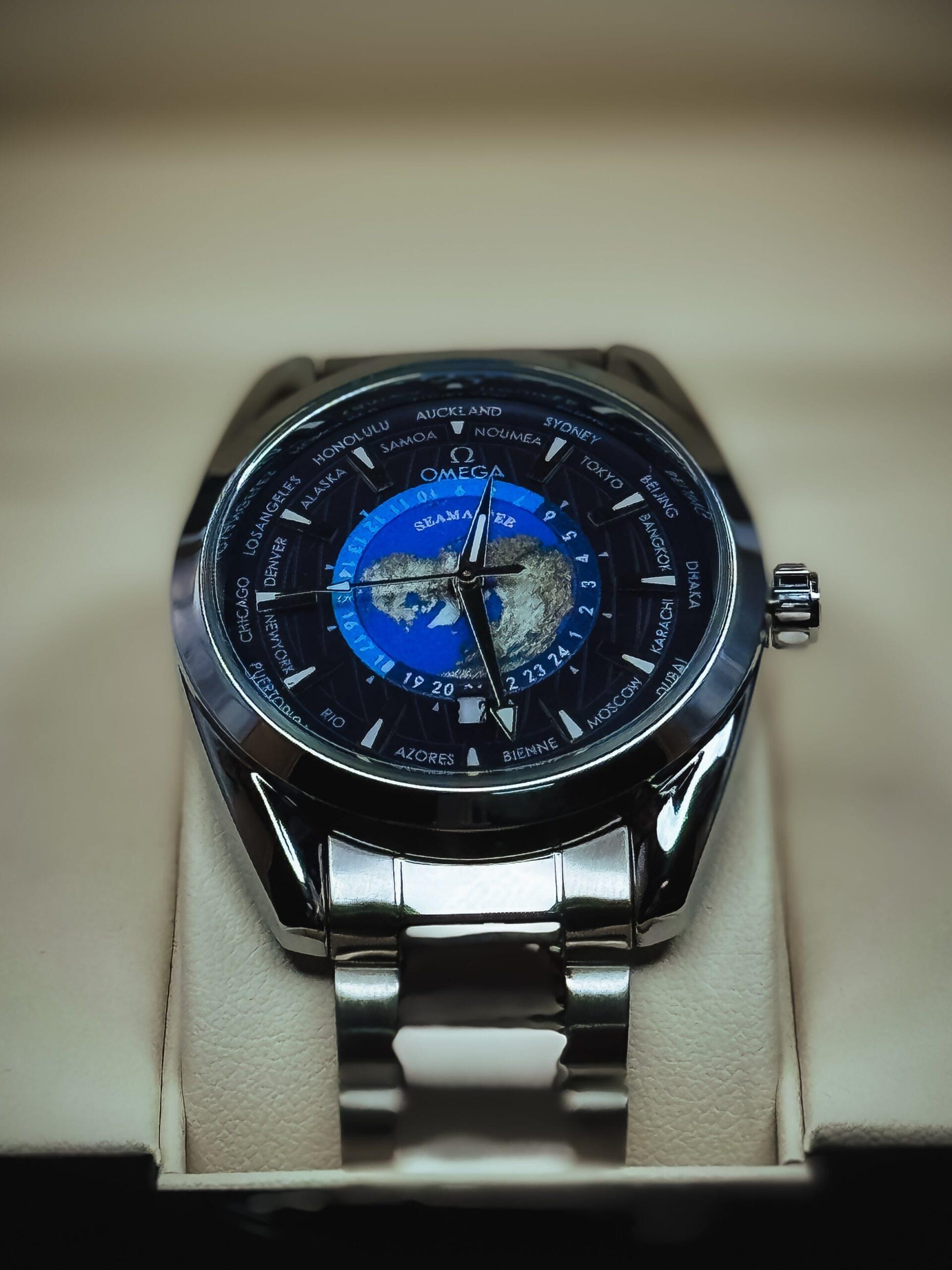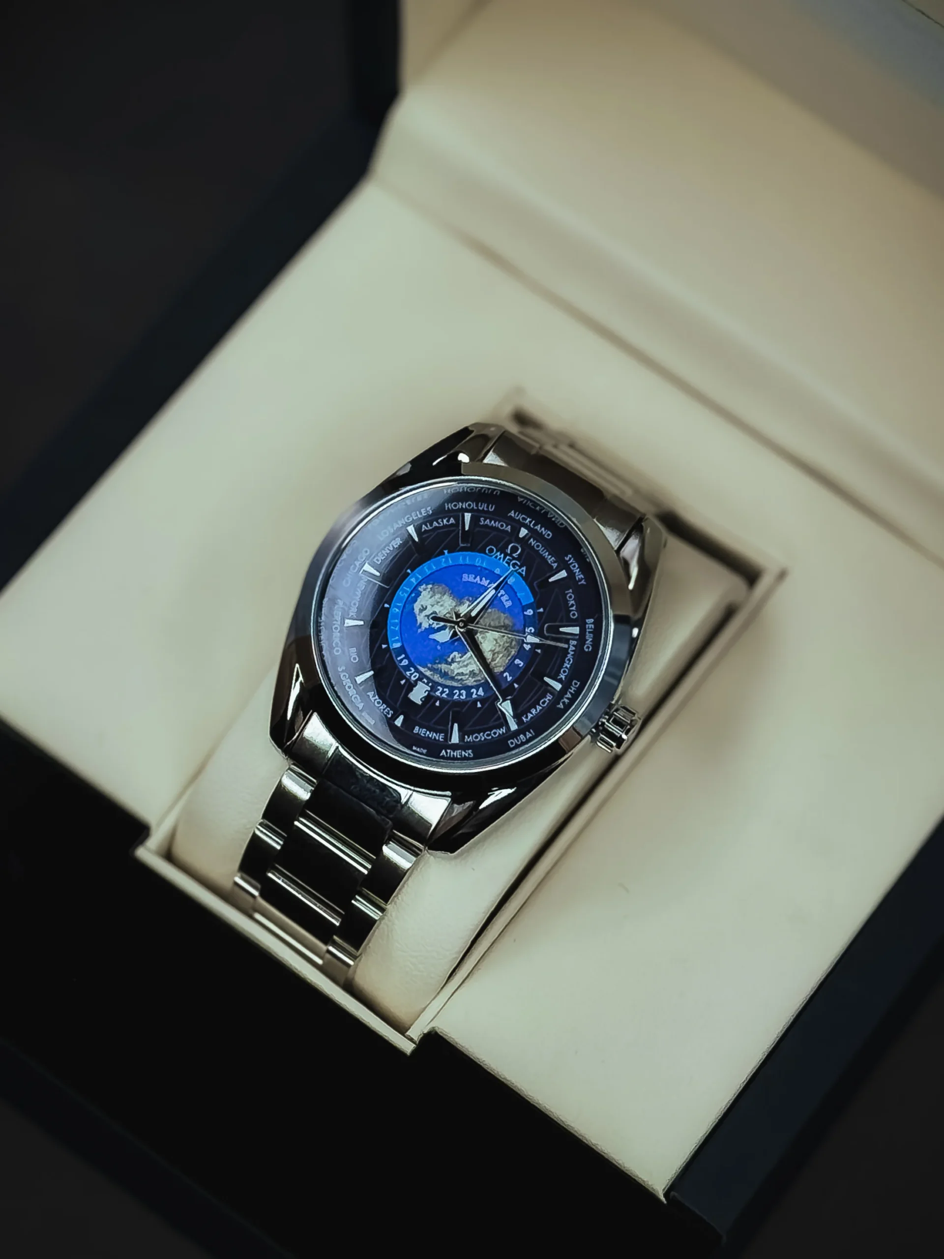 Discover the elegance of global adventure with the Omega Seamaster featuring a captivating Worldmap dial. This timepiece combines Omega’s legendary precision with a unique design inspired by exploration and travel. The dial showcases a detailed map of the world, beautifully rendered with oceanic textures and raised land contours, offering a striking visual centerpiece.