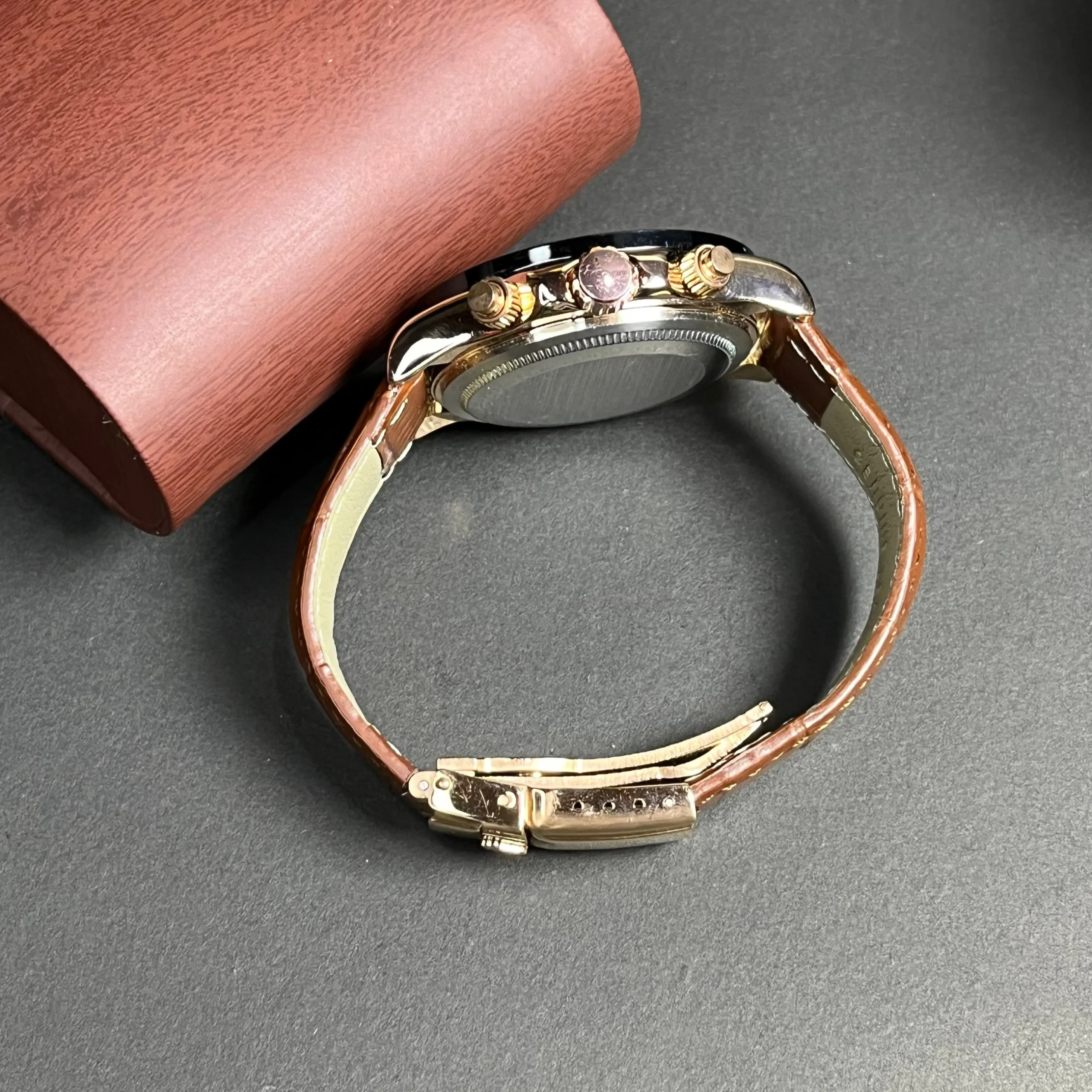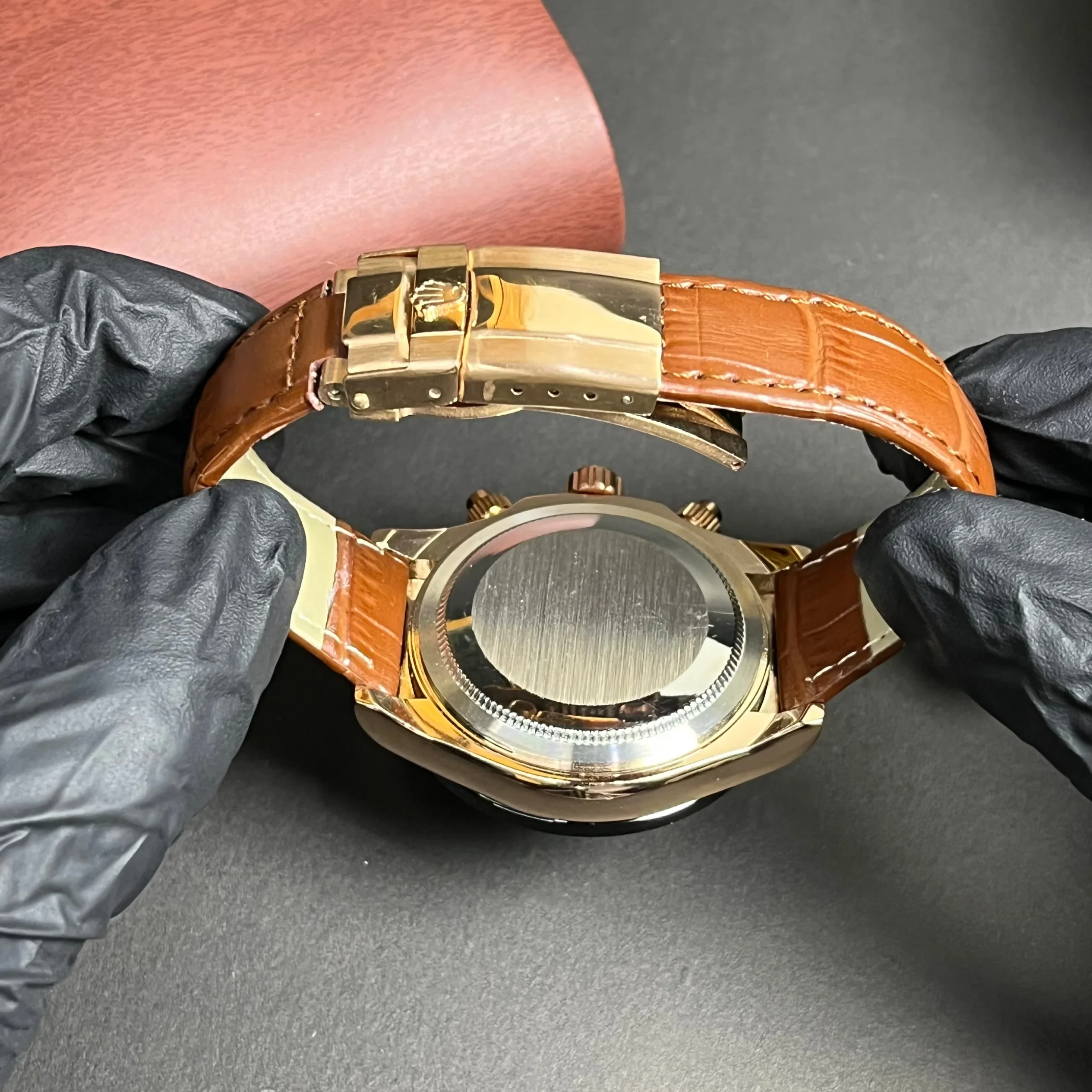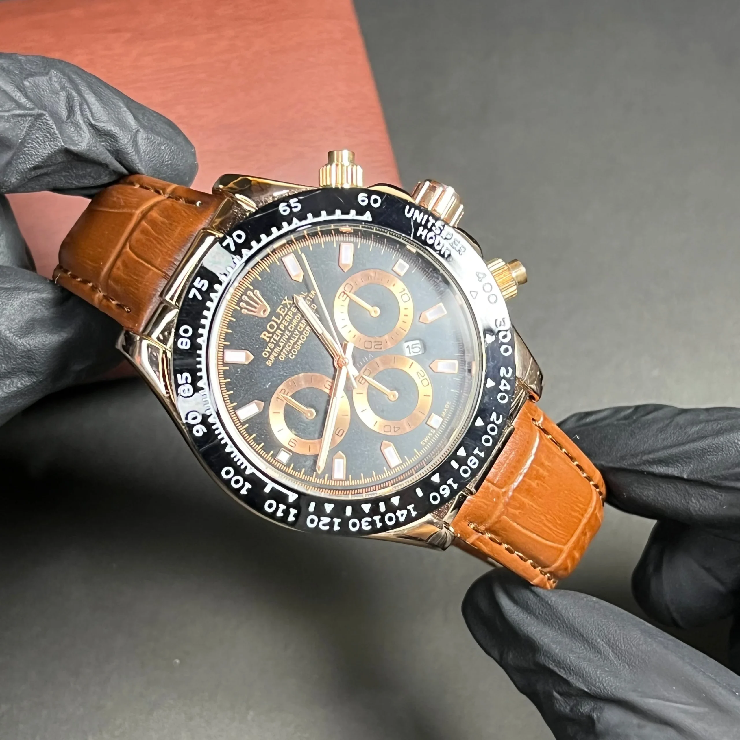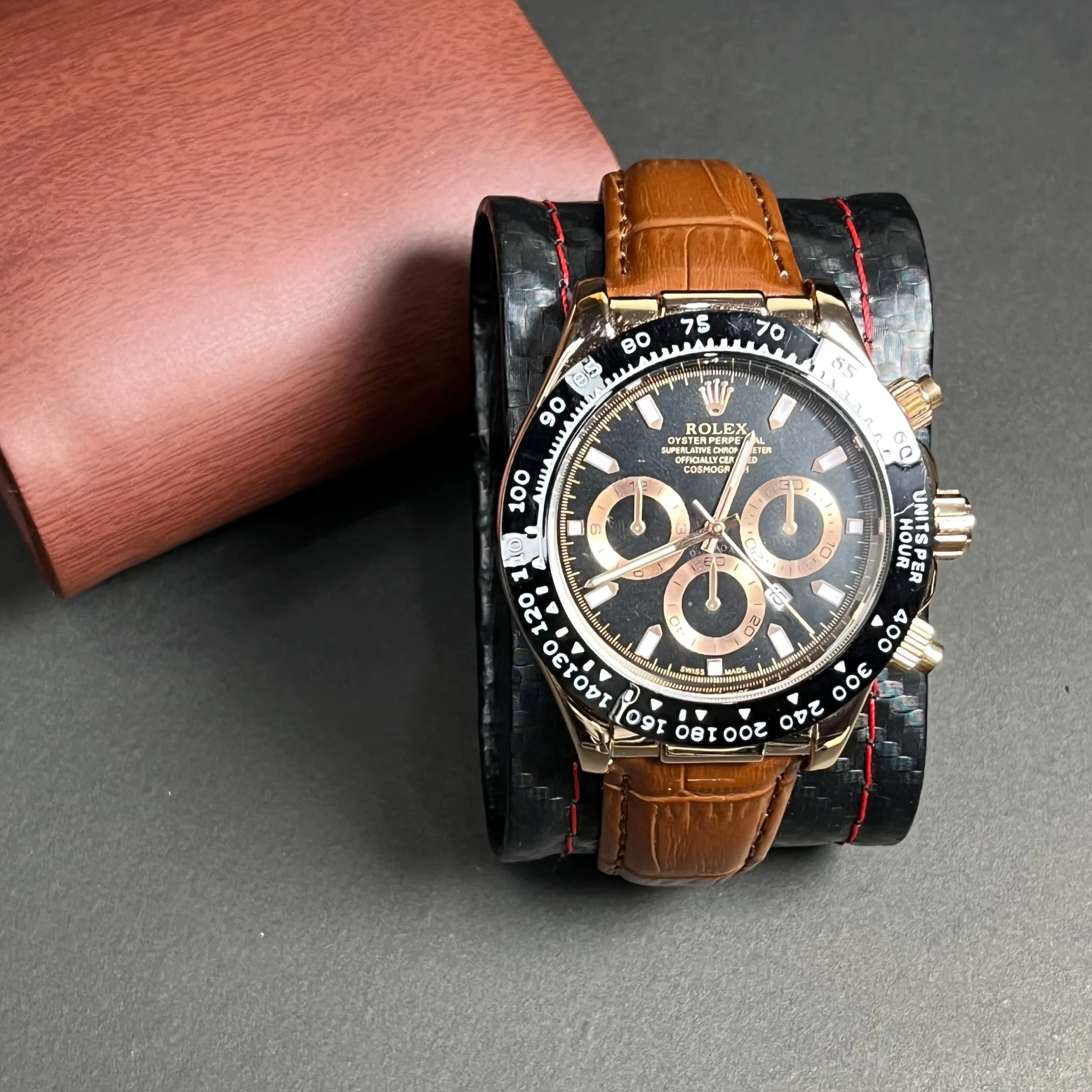 Rolex Daytona – A legendary chronograph combining leather strap and bronze touch, and designed for precision, durability, and timeless luxury. Perfect balance of sport and elegance.