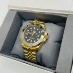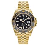 This luxurious timepiece draws inspiration from the prestigious Rolex GMT-Master II, crafted with a full gold finish that exudes sophistication and power. Featuring a striking black dial, a rotating 24-hour bezel, and dual time zone functionality, it’s designed for those who appreciate bold elegance. The classic Oyster-style bracelet and luminous hands complete the look, making it the perfect statement piece for any occasion.
